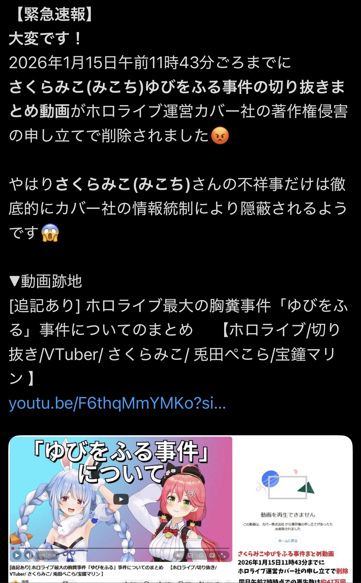| … | 3826/01/15(木)23:24:21No.1392826552そうだねx13>みこちのときだけ即反応して必死に消すのさぁ |