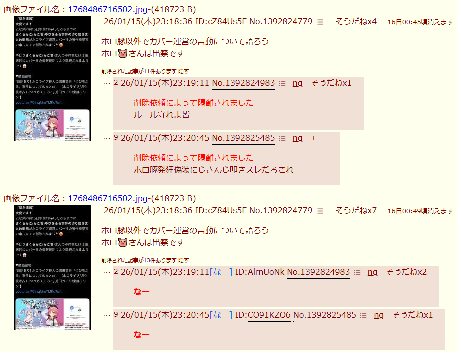 | … | 2026/01/15(木)23:21:38No.1392825793そうだねx15>ホロ豚発狂偽装にじさんじ叩きスレだろこれ |