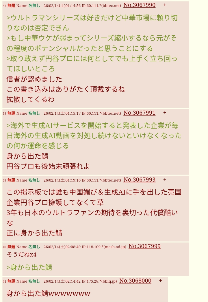 | … | 5726/03/21(土)19:11:45No.1412885964そうだねx11>ウルトラマン粘着してる時と手口が一緒 |