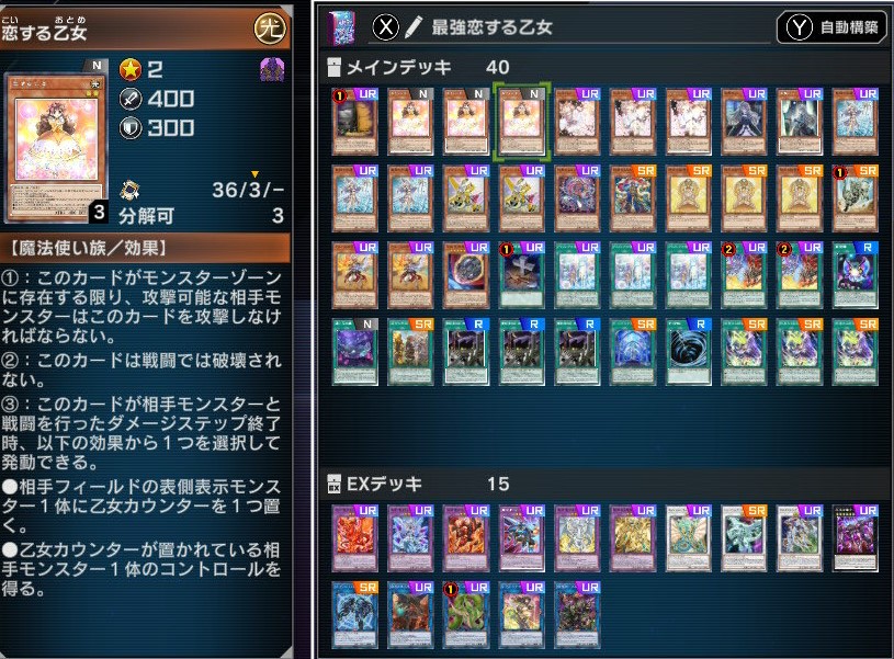 | … | 5626/03/29(日)00:39:41No.1415230370そうだねx2待機時間に今回使った恋する乙女デッキ紹介 |
