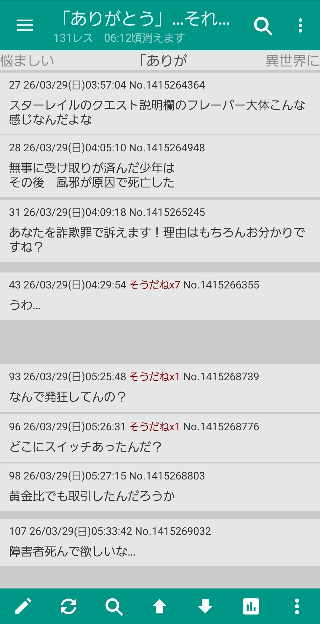 | … | 10726/03/29(日)05:33:42No.1415269032+障害者死んで欲しいな… |