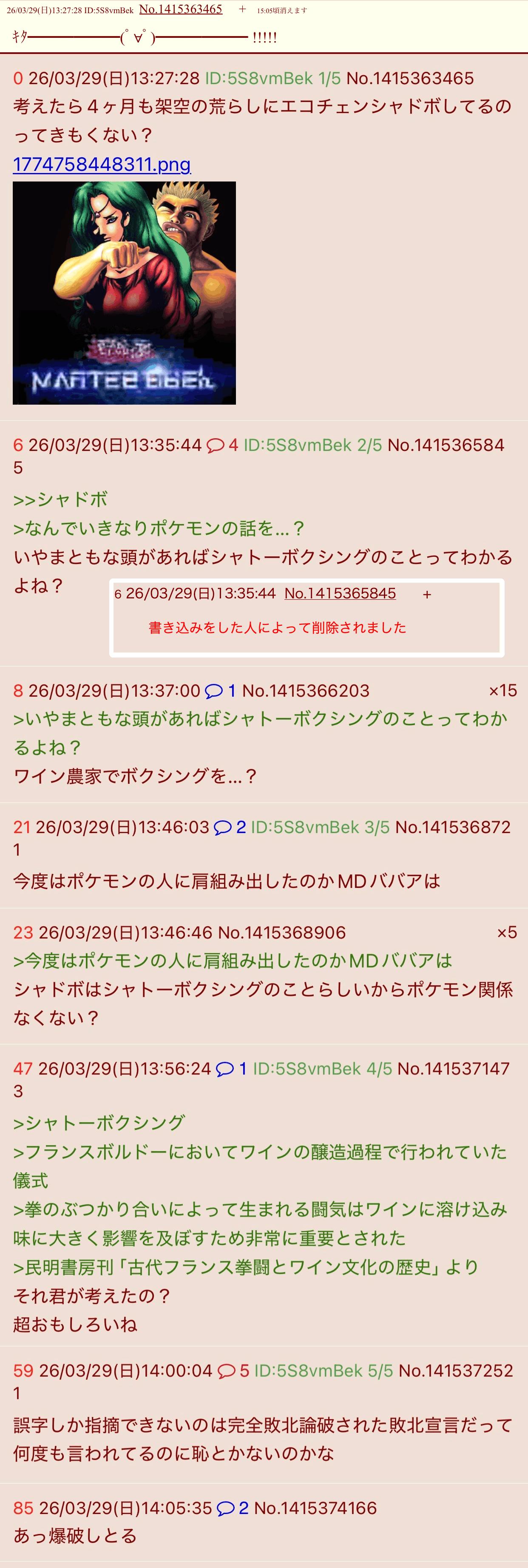 | … | 3426/03/29(日)13:51:16No.1415370105そうだねx3なんでシャトーボクシングのレス消したのー? |