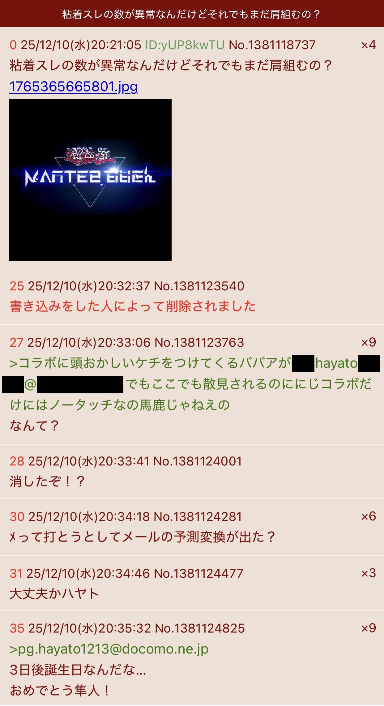 | … | 826/03/30(月)20:04:02No.1415799210そうだねx2存在が不確かも何もメアド晒したハヤトは居るだろ |