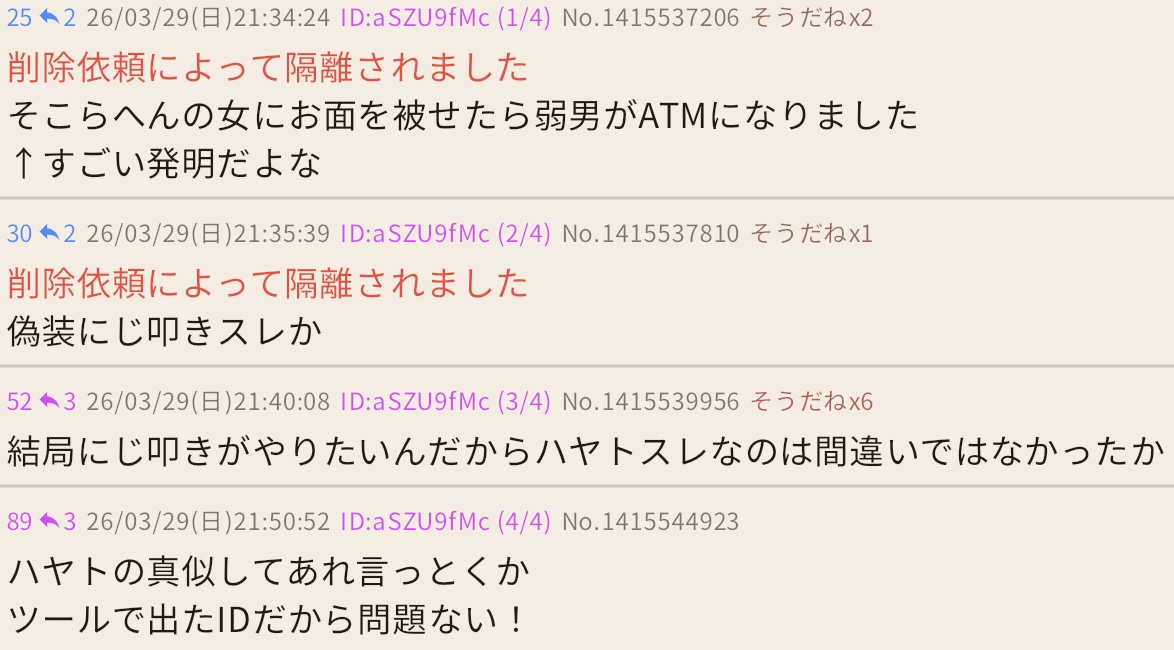 | … | 726/03/30(月)20:04:00No.1415799197そうだねx4自演バレしたしね |