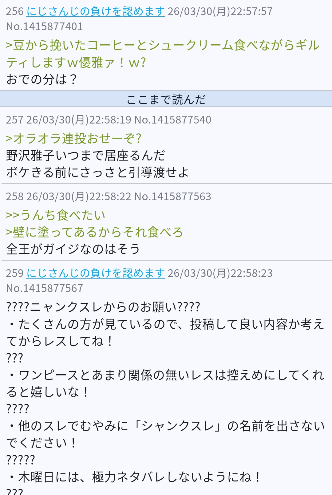 | … | 8226/03/30(月)22:48:40No.1415873548そうだねx4>開封粘着スレもお前がやってたんか |