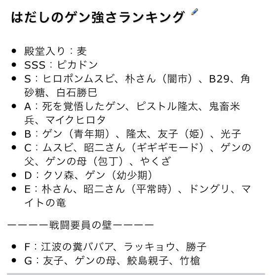 | … | 7526/04/09(木)19:28:07No.1418744466そうだねx3>はだしのゲンtier表って何? |
