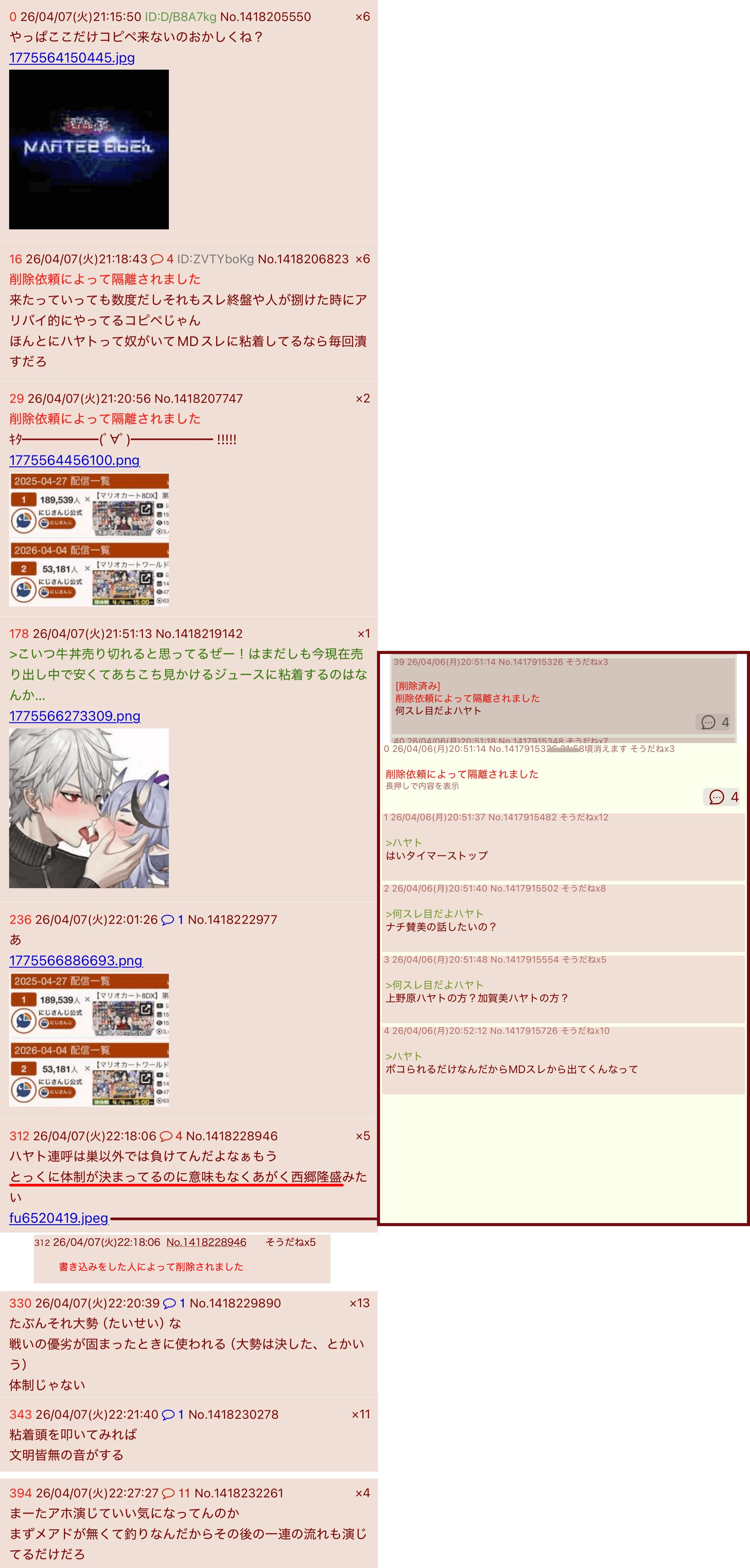 | … | 626/04/09(木)20:17:07No.1418761078そうだねx11>被害者ヅラスレ立ててる奴がハヤト連呼だったからいつものこのスレも誰が立ててるのかわかってしまたなぁ? |