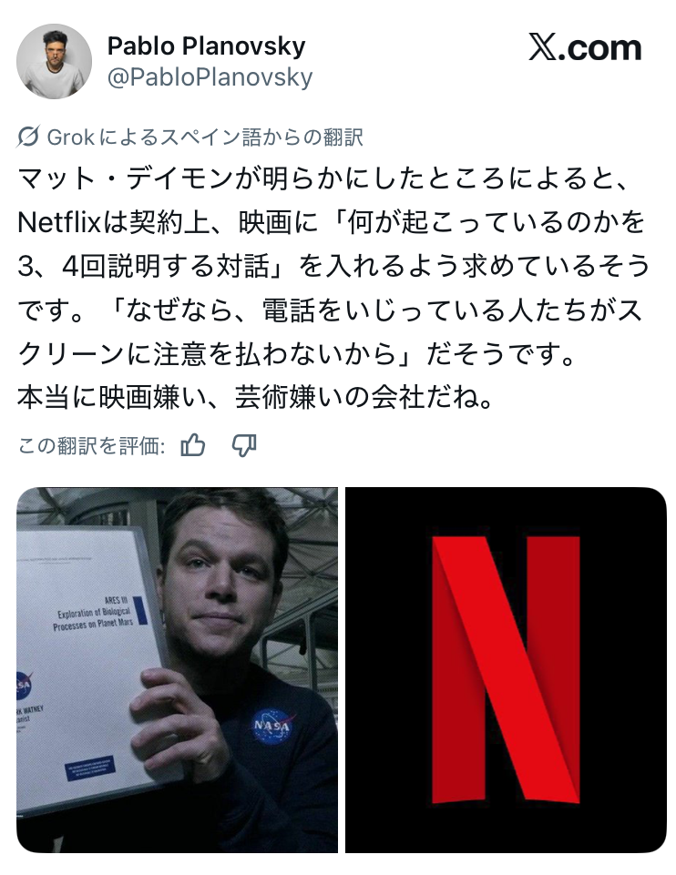 | … | 1226/04/11(土)09:11:20No.1419202332そうだねx21Netflixは字幕完備&吹き替え時にも字幕表示可能という点だけで |