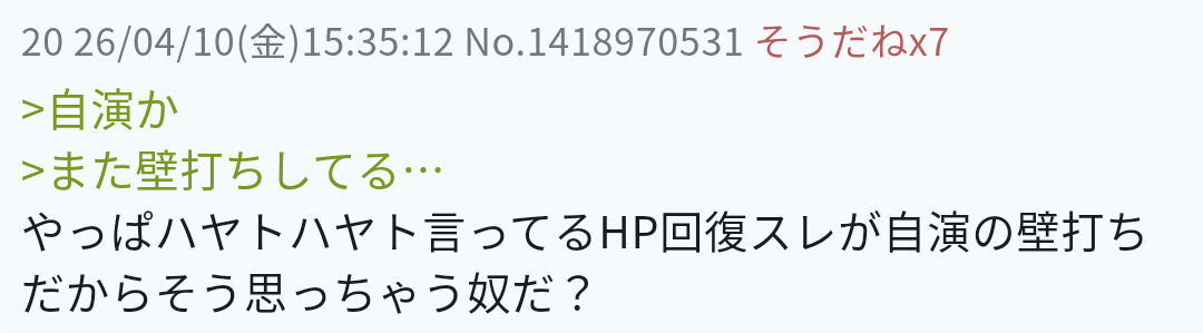 | … | 9926/04/11(土)19:51:33No.1419372647そうだねx1>>まずスレ立ててHP回復ってのがわかんないんだよね |