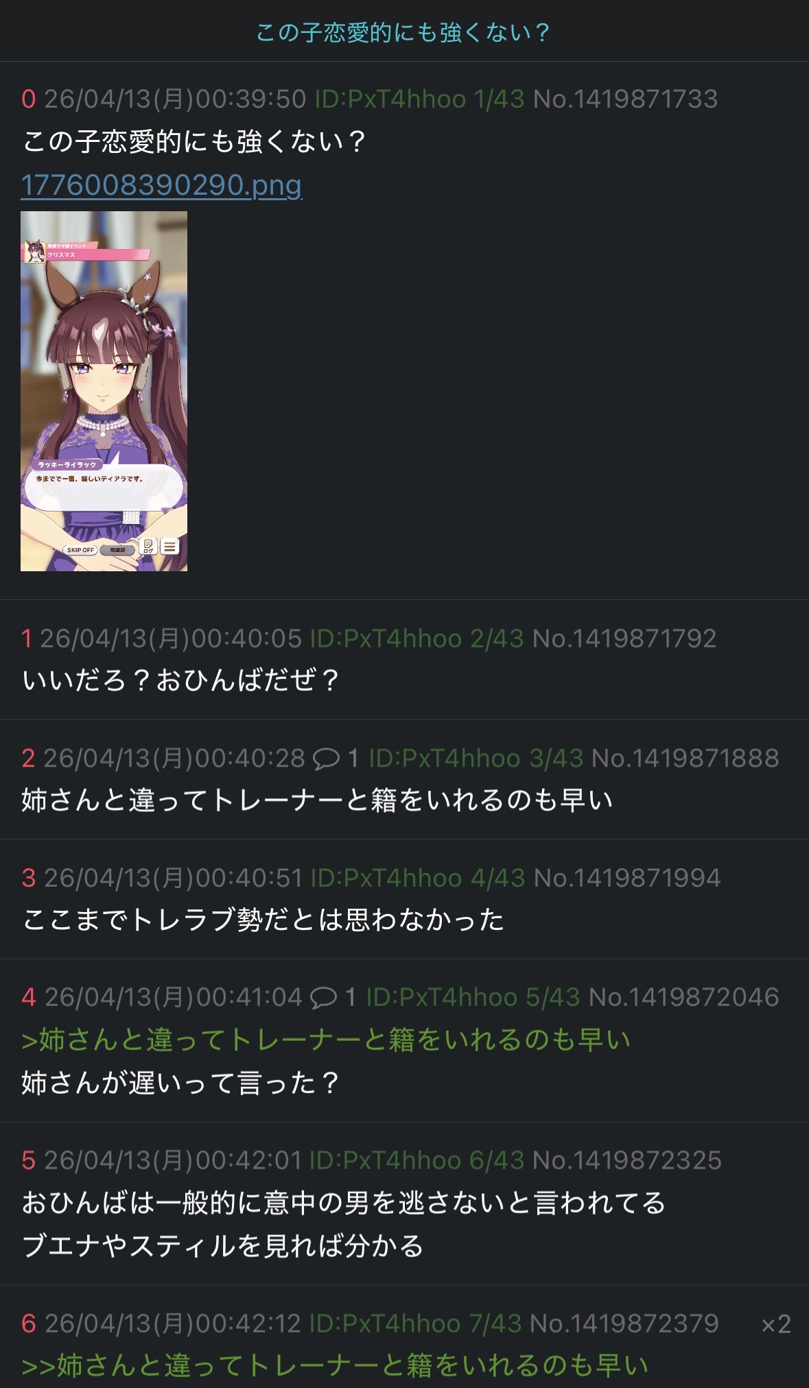 | … | 1026/04/13(月)01:11:03No.1419879607そうだねx1コピペでトレウマスレ立てる |