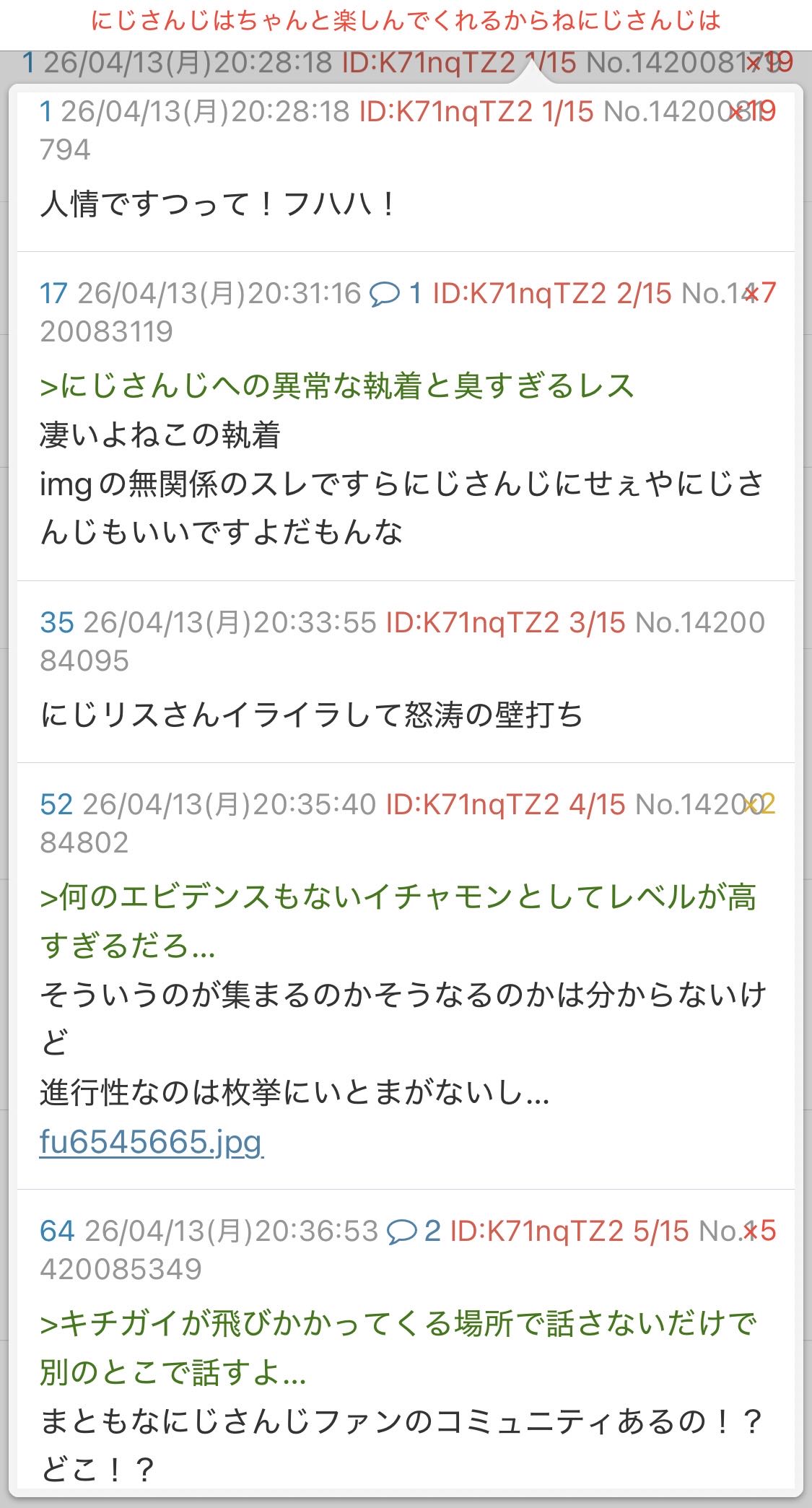 | … | 29626/04/13(月)22:11:59No.1420123203そうだねx3>獅白杯の感想スレでみんなホロライブの話してる中「にじリスが〜」「にじさんじが〜」とか言って全部管理されてたスレ「」最高に無様だったよ |