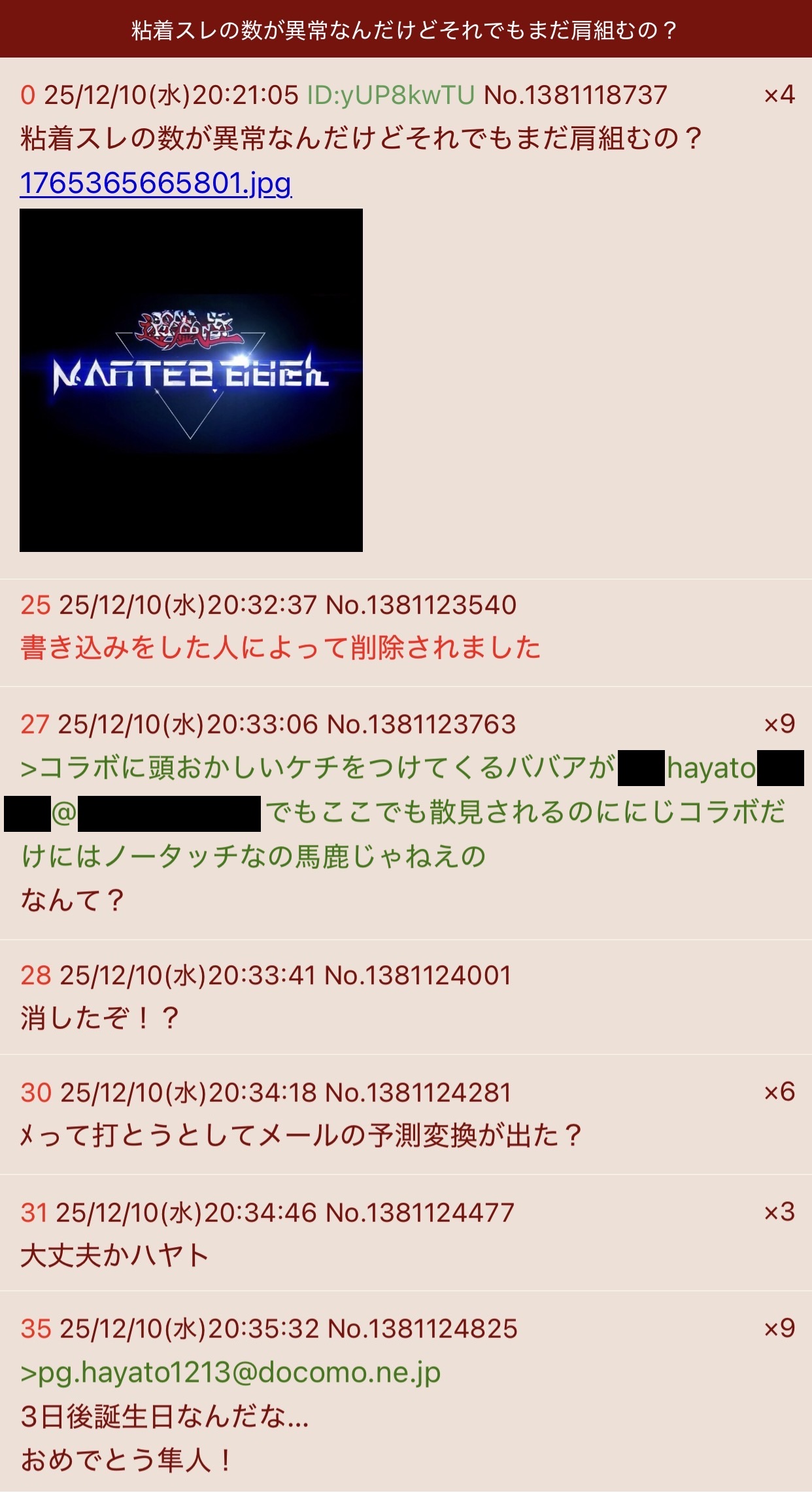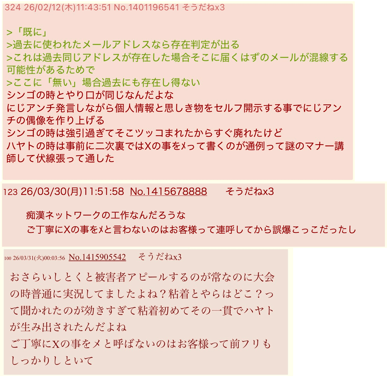 | … | 74026/04/13(月)23:30:10No.1420152453+>何か工作したい事は分かるがそれで自分のメールアドレスを誤爆したハヤト君の罪が軽くなるのかは全く分からないんだ |