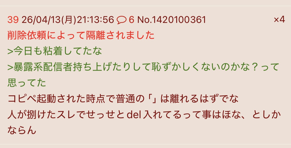 | … | 4026/04/13(月)22:22:45No.1420127526そうだねx10>荒らされてる被害者なら板作ってもらえるよ |
