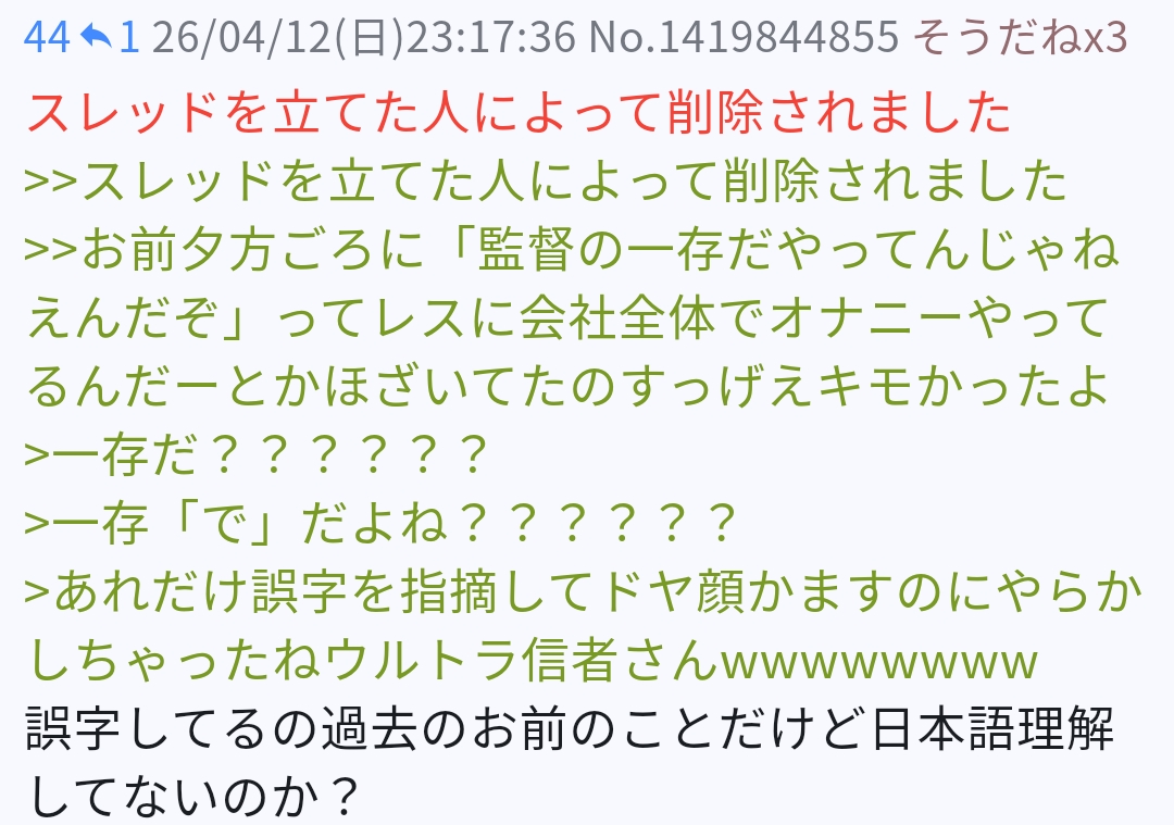 | … | 69926/04/13(月)23:27:25No.1420151583そうだねx6>伸びて勢いあるタイミングだとdel貰って潰されるから |