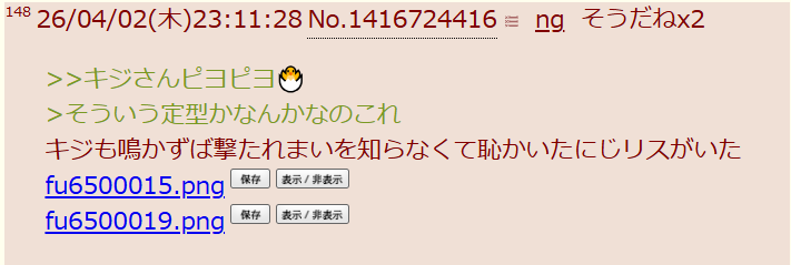 | … | 2126/04/13(月)22:19:04No.1420126089そうだねx3雉板は? |
