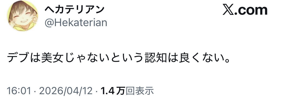 | … | 626/04/14(火)00:51:24No.1420176034+デブの美女を美女だと思わない人がいる以上このデブ美女を見ろ!と言っても晒し上げにしかならん |