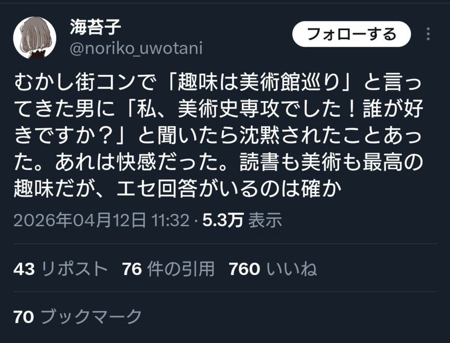 | … | 5426/04/14(火)09:15:53No.1420216455そうだねx26「美術史専攻でした!」なんて前置きされたら(下手なこと言えないな…困った…)って止まっちゃう人はいると思う |