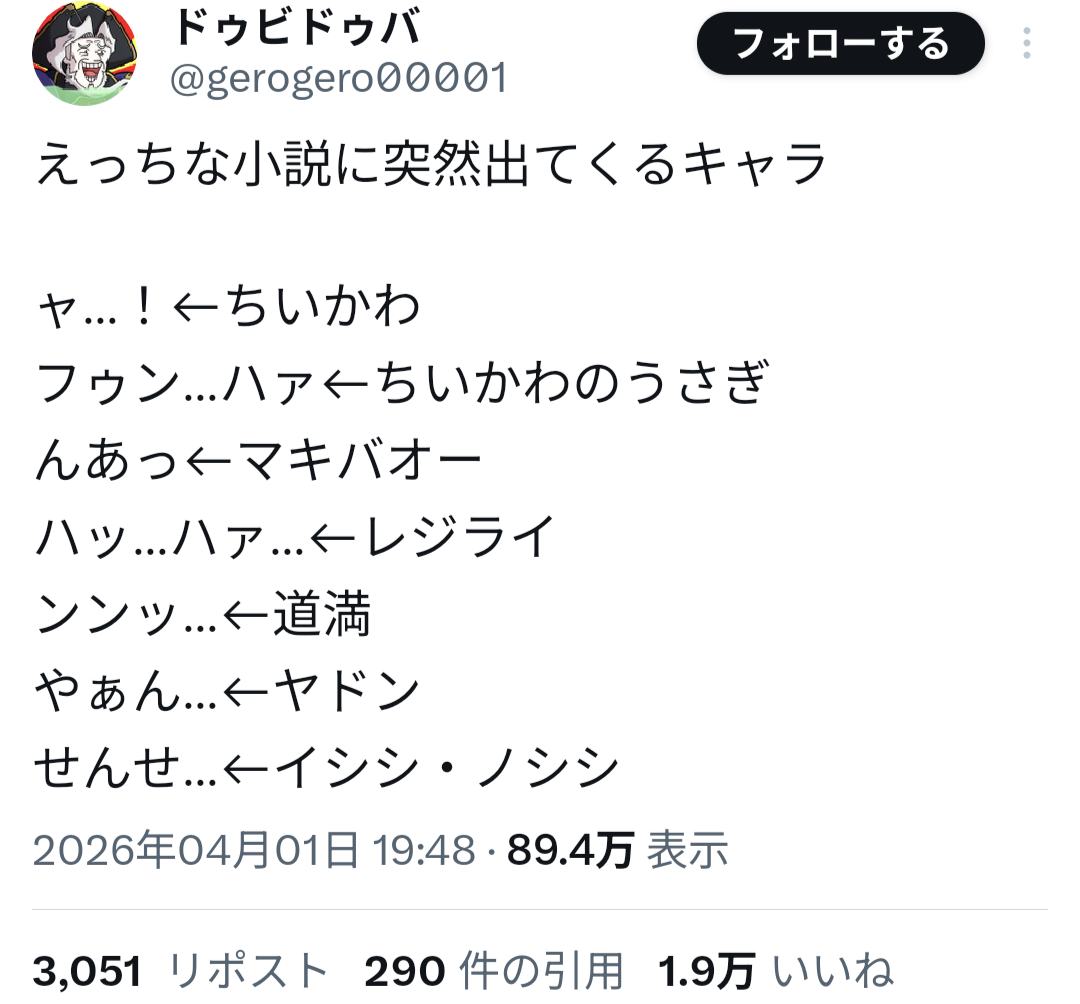| … | 2026/04/14(火)13:57:33No.1420277013+好きなエロ小説のアオォとかハウッハウハウエッとか出てくるんだけどセリフだけ書くと面白いな |