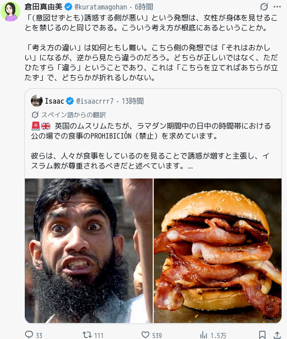 | … | 6026/04/14(火)15:01:43No.1420288902+>ムスリムと触れ合ってないから知らないんだ |