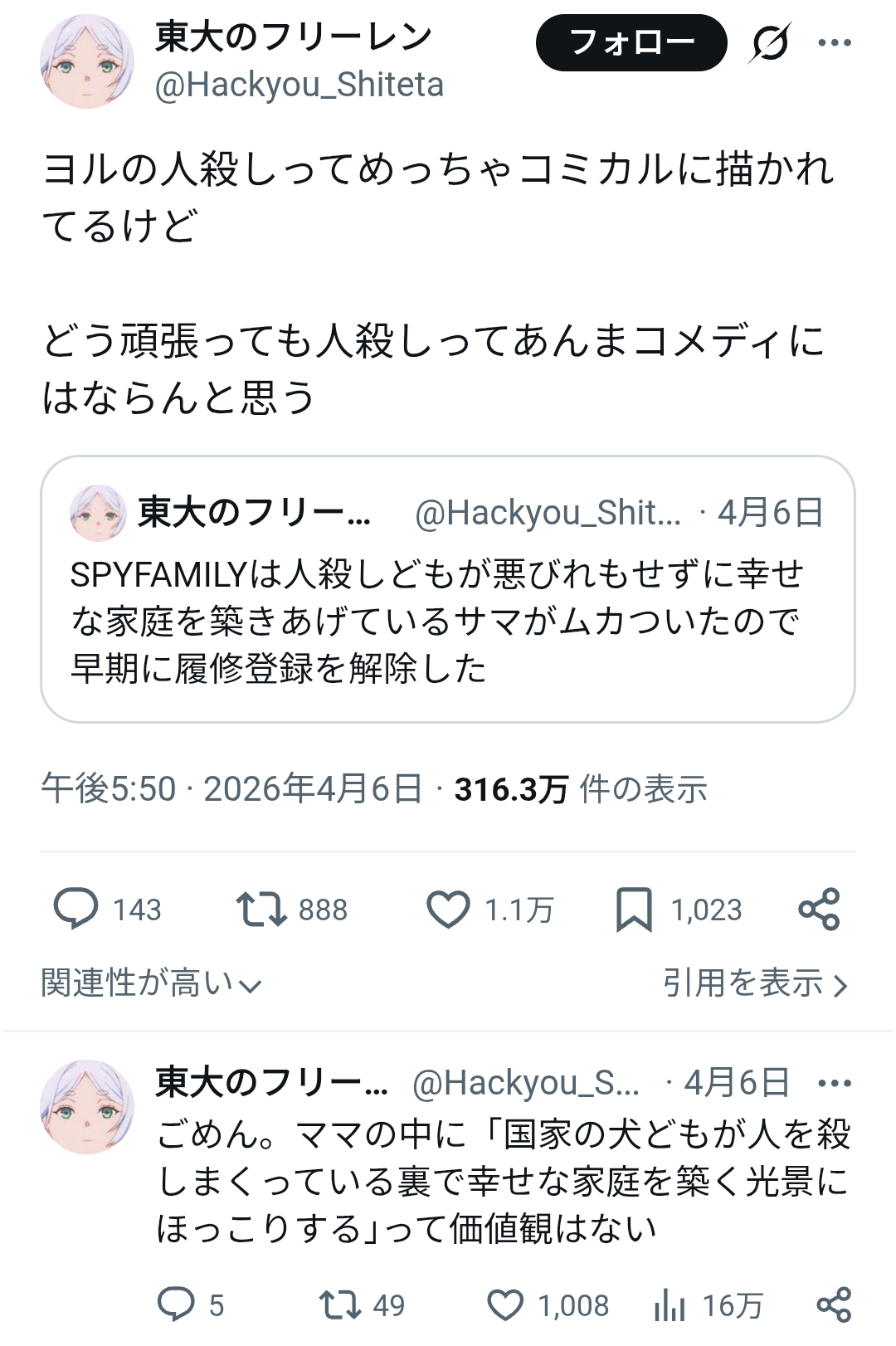 | … | 3626/04/14(火)18:51:20No.1420340632+スパイファミリー貶してるのがフリーレンアイコンってのがなんか全て物語ってる |