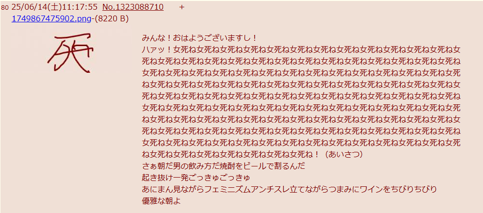 | … | 3425/08/05(火)17:50:42No.1340256594そうだねx6>無職ってなんで親に暴力振るうの? |