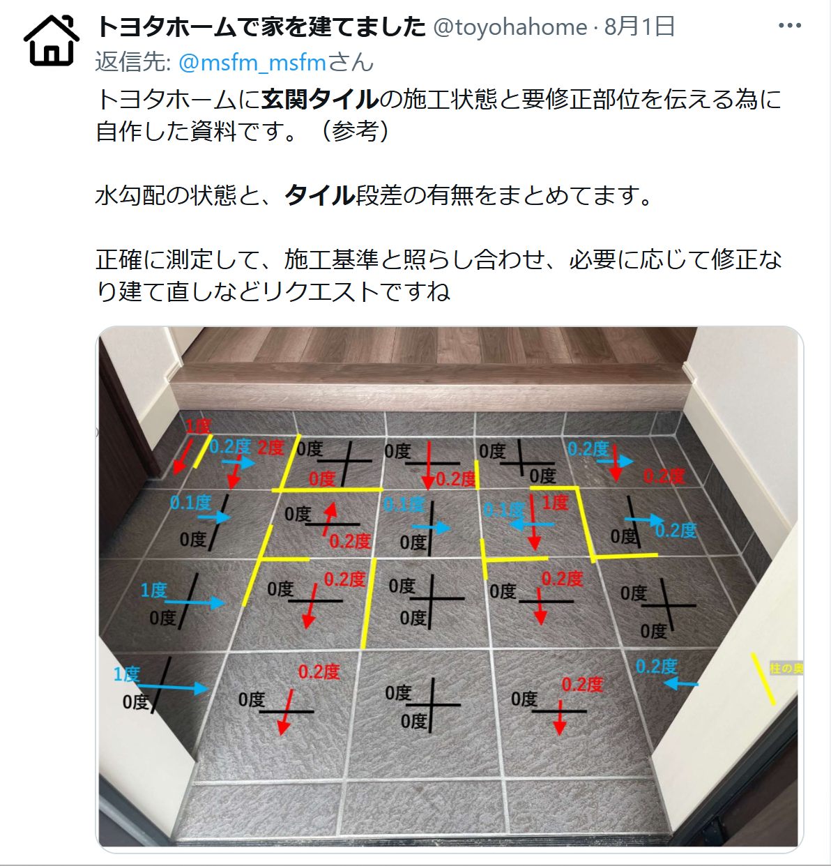 | … | 1225/08/06(水)08:34:57No.1340444199+そこの玄関タイルを踏んで実際その0.2度とかの段差が体感的に気になるようなら結構ストレスになりそうかも |