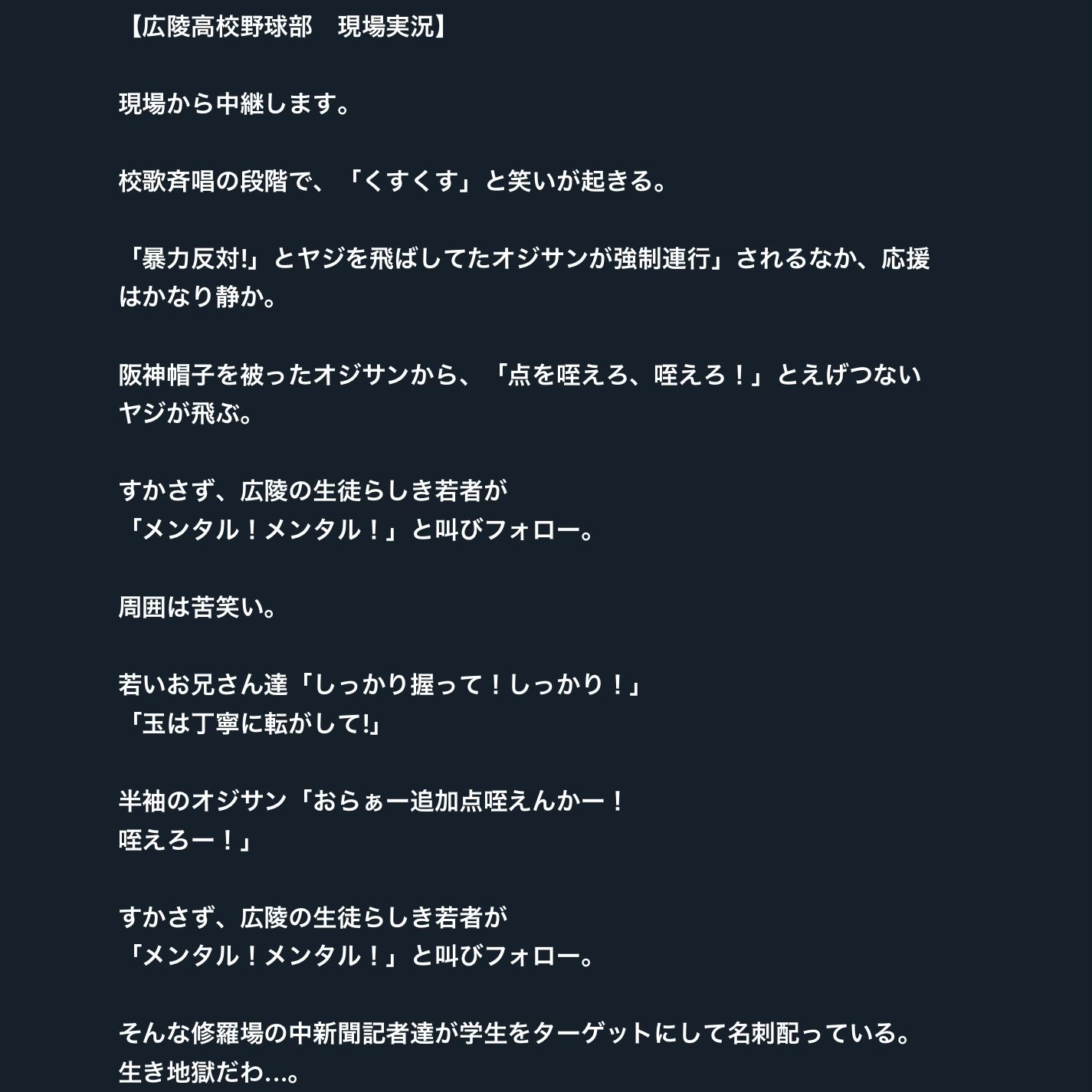 | … | 94025/08/09(土)07:53:43No.1341322522+>広陵って親子で目指す美談記事の見出しだけ覚えてたけど今その親子が監督選手じゃなくて監督部長と知って |