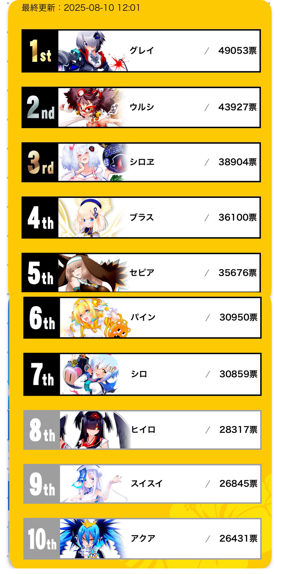 | … | 4025/08/10(日)13:27:20No.1341734117+グレイは灰柱がいなくても総合順位4位キープできる票数あるけど |