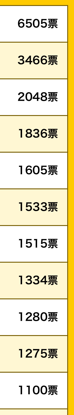 | … | 3125/08/11(月)20:57:02No.1342206519+パプっちゃんはベスト20平均得票数がけっこう高いなあ |