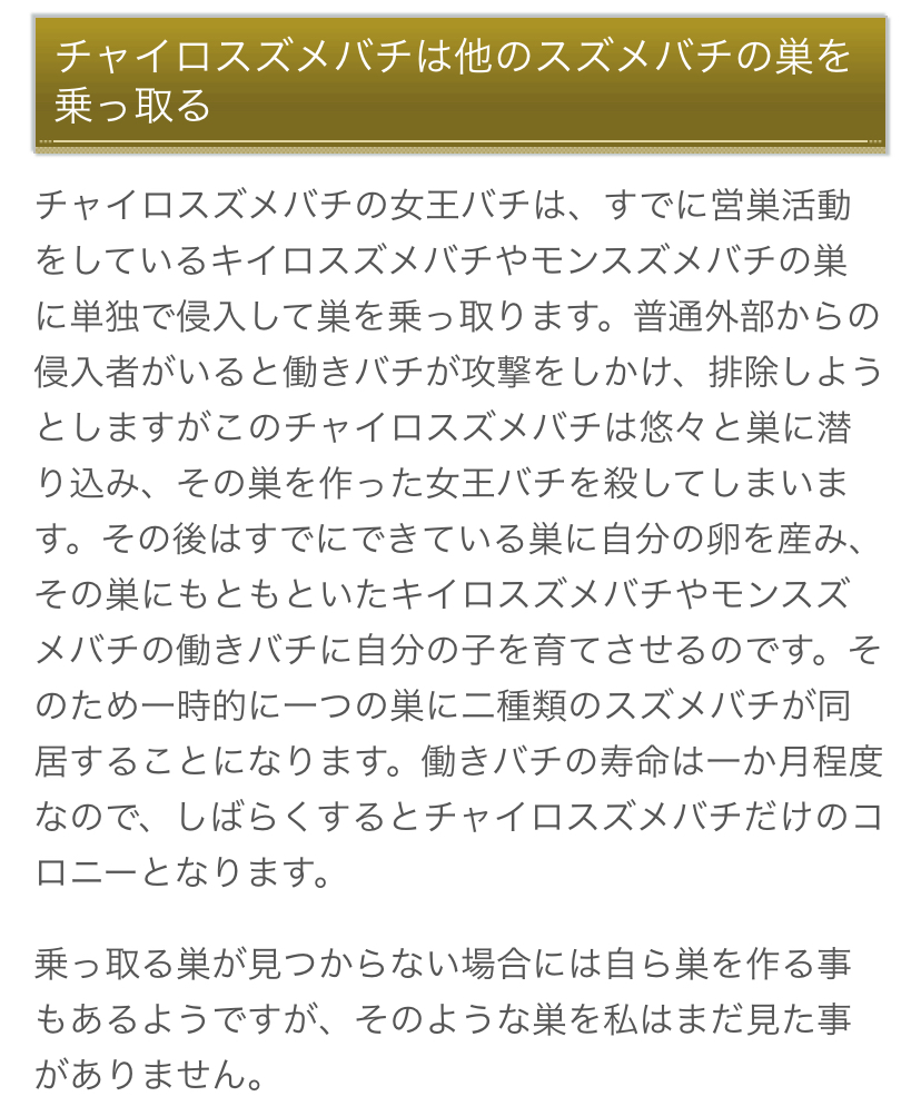| … | 12925/08/13(水)15:41:48No.1342783281+>オオスズメバチの巡回ルートに入ると他の種類のスズメバチが巣を作らなくなるのでありがたいんですよ… |