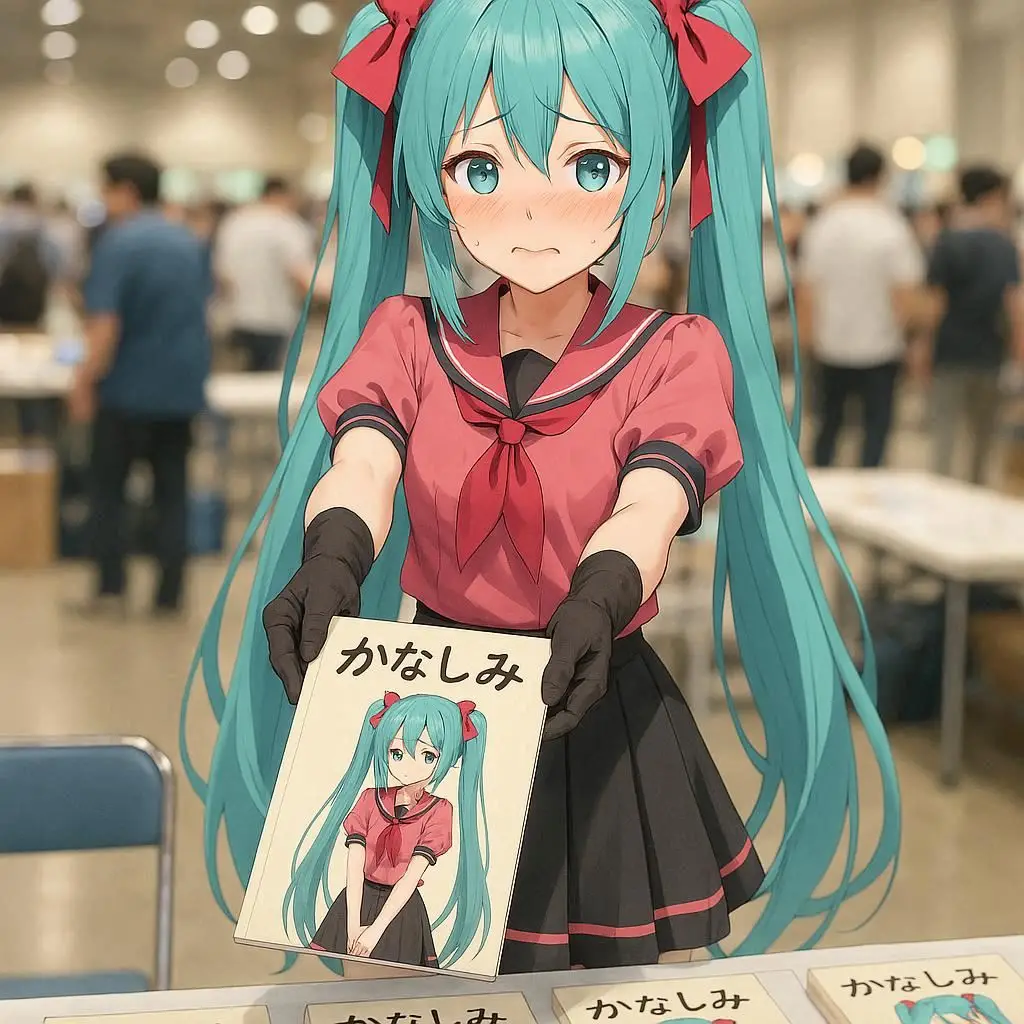 | … | 525/08/13(水)19:27:44No.1342848857+同人誌即売会の会場で、初音ミクがアニメのキャラクターにコスプレしながら自分を題材にした本を手渡しているイラスト、恥ずかしそうな表情、テーブルに冊子が並んでいる |