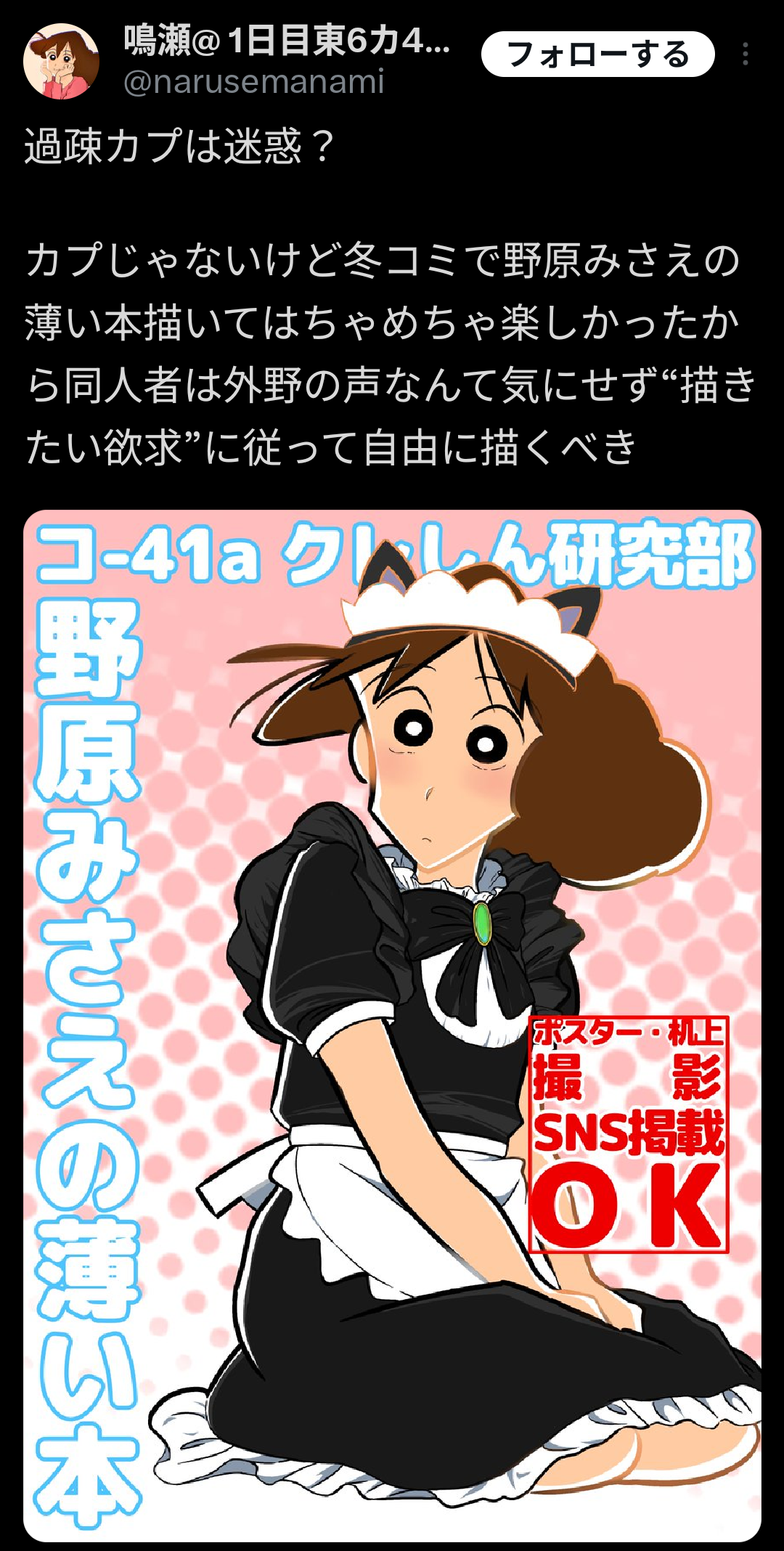 | … | 625/08/16(土)11:03:59No.1343696514そうだねx4みさえのエロ(健全本)が出せる度量の深さこそがコミケやろ |