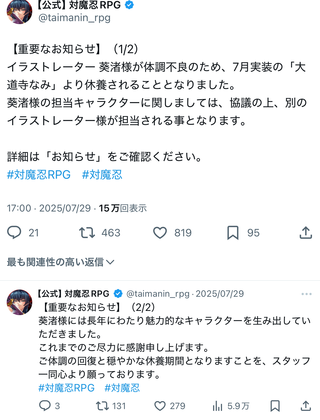 | … | 8125/08/16(土)18:06:06 ID:teFroQbUNo.1343809701+イラストレーターもライターも抜けてるし単純に手が回らない可能性はあると思いますからよ… |