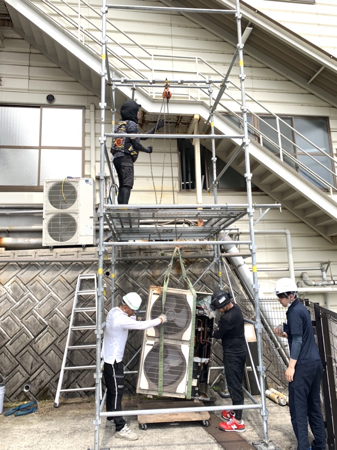 | … | 9825/08/18(月)00:27:18No.1344332977+現場で見る設備屋は高所作業車使ったり足場使ったりだけど後からエアコン増設とかだとこうなんのか…? |