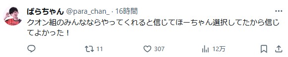 | … | 92725/08/18(月)14:20:41No.1344456438そうだねx6>>媚び売りイベで態々少数派におもねるのはファンキーと言わざるを得ないルナ |