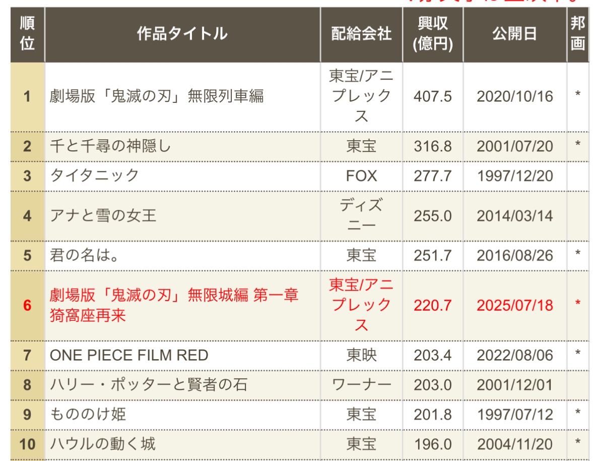 | … | 525/08/18(月)14:25:20No.1344457433そうだねx1アニメ『鬼滅の刃』の最新作となる劇場版『鬼滅の刃 無限城編 第一章 猗窩座再来』(7月18日公開)の興収情報が発表され、公開31日間で観客動員数1827万2941人、興行収入257億8265万6600円を突破した。国内の歴代興収ランキングは『アナと雪の女王』(2014年公開)の興収255億円を抜き、歴代4位にランクインした。 |