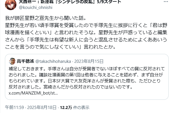 | … | 4625/08/18(月)17:52:19No.1344502436そうだねx10漫画の神様だんだけどそれ以前に漫画のガキ大将なんだよね |