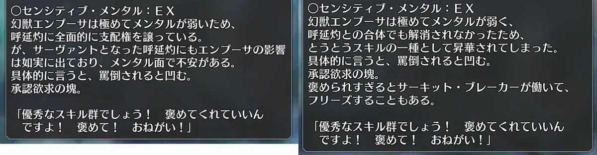 | … | 9125/08/19(火)17:50:36No.1344827986+>エンプーサメインですって最初から言われたらそうですかってなるのにアサシン霊基の一臨だと明らかにエンプーサと違う呼延灼としての振る舞いしてて混ざりものアピールしてくるから???ってなる |