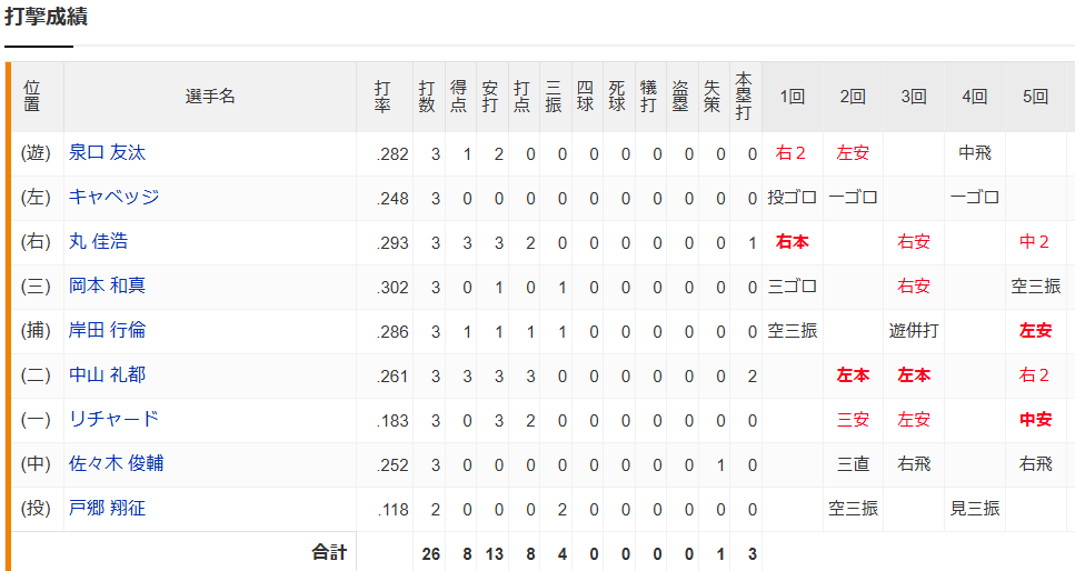 | … | 4225/08/19(火)18:39:20 ID:GQwukjvINo.1344842186そうだねx4古賀優大 塁別打率 |