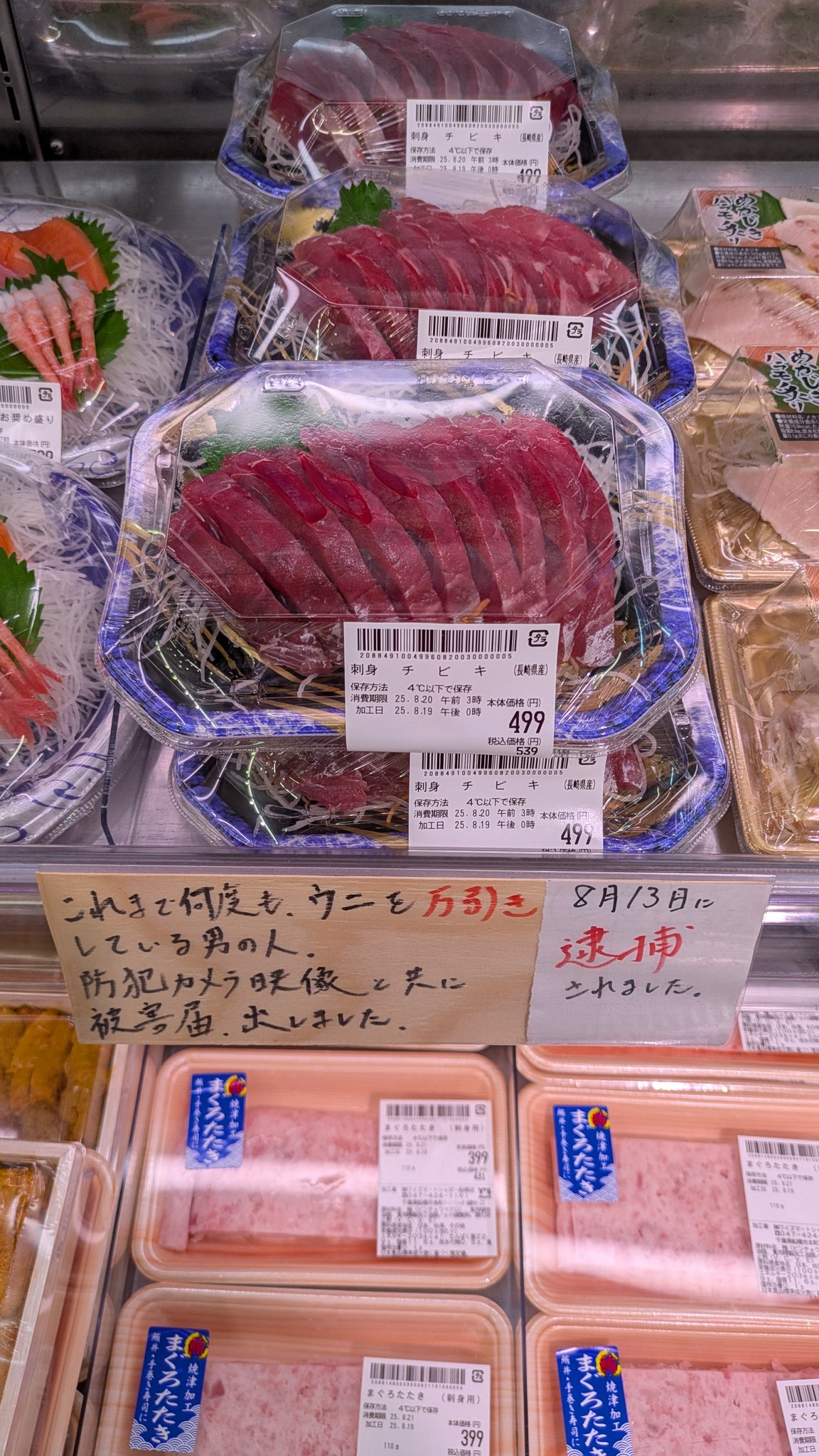 | … | 5225/08/19(火)20:33:24No.1344885001+それでどの刺身が万引き犯なの? |
