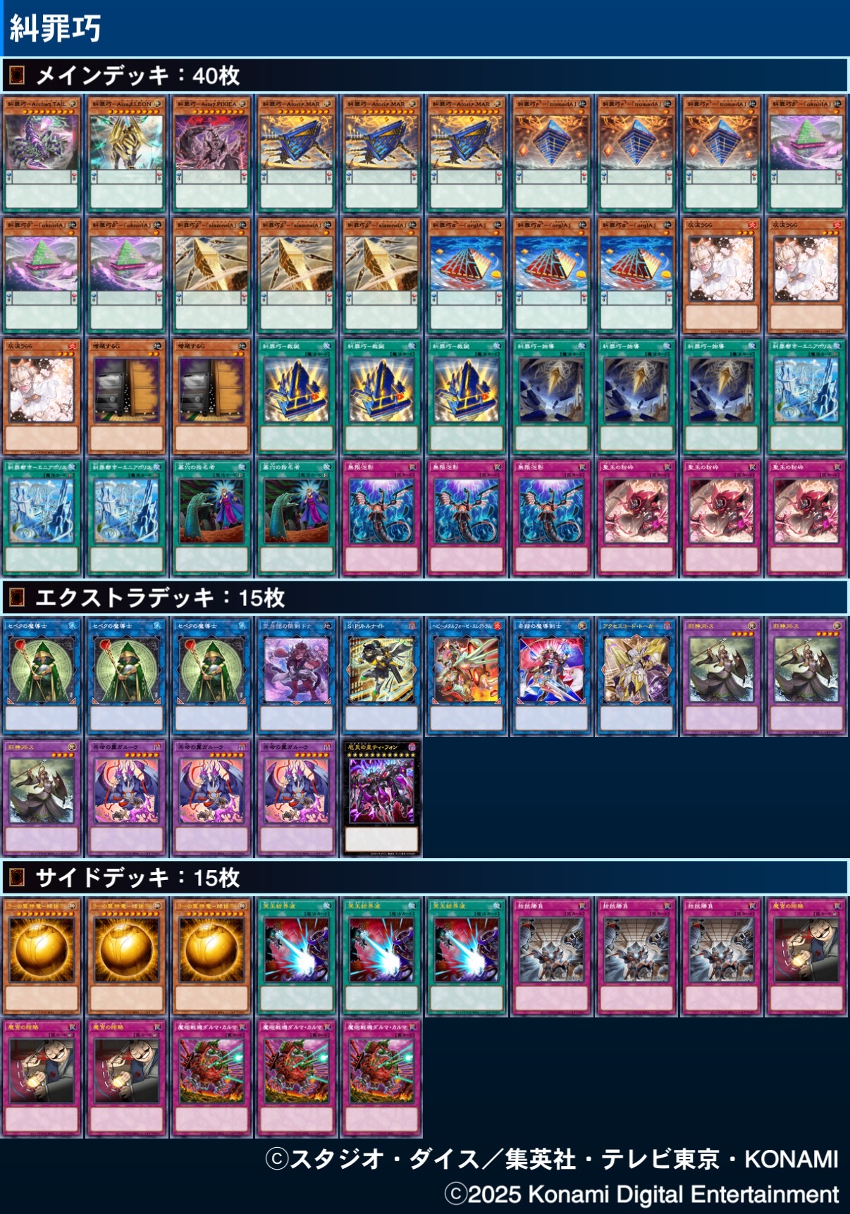 | … | 30525/08/22(金)10:20:16No.1345658425+糾罪巧はサーチ効果が3枚からランダムな関係上全員3積みしたいのは山々だけどそうすると多分デッキが嘘でしょ…みたいなことになる |