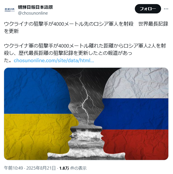 | … | 20225/08/22(金)21:12:35No.1345830321そうだねx1ウクライナでの狙撃新記録は度々出てるけど第三者による検証が全くなされていないので |