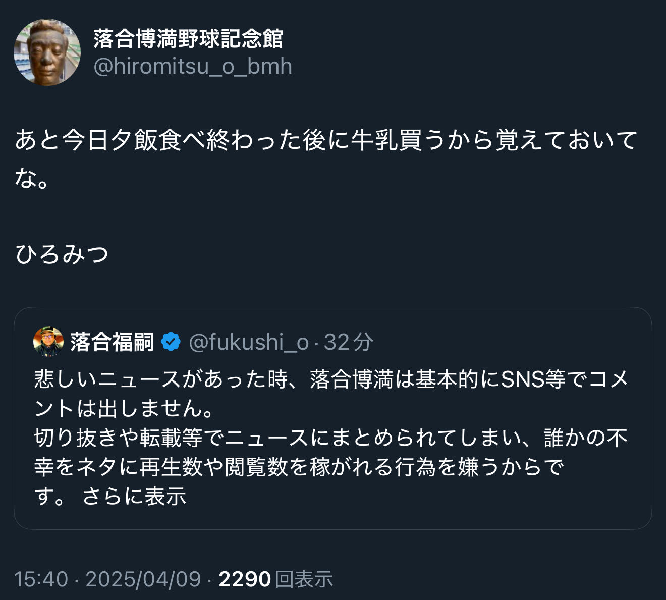 | … | 2825/08/23(土)12:11:40No.1346016125+本人の努力なかったら落合記念館館長で終わってたかもだしな |