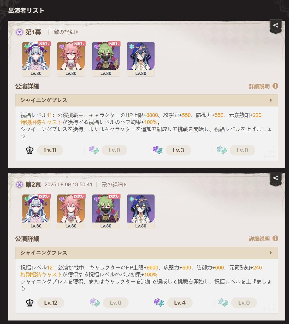 | … | 4025/08/23(土)14:21:55No.1346052694+今期シアターはおためし編成でもみんな相当やれる方だから育成してなくても全然困らなかったけど2期前とかヤバかったからなぁ |
