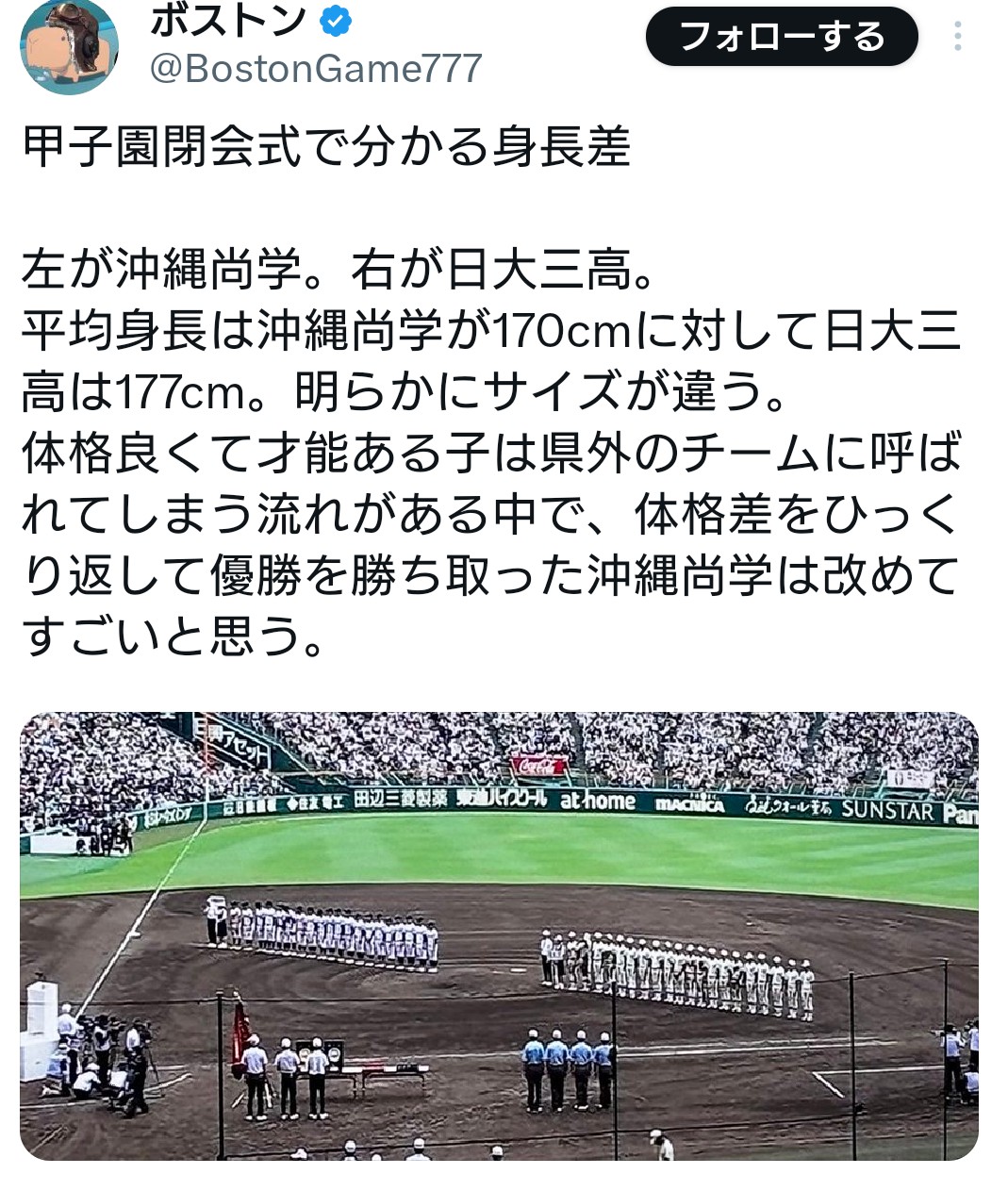 | … | 15625/08/23(土)18:35:08No.1346119855+>俺の母校(公立)が甲子園出た時も強豪私立の相手と並ぶとガタイが違いすぎて驚いたな |