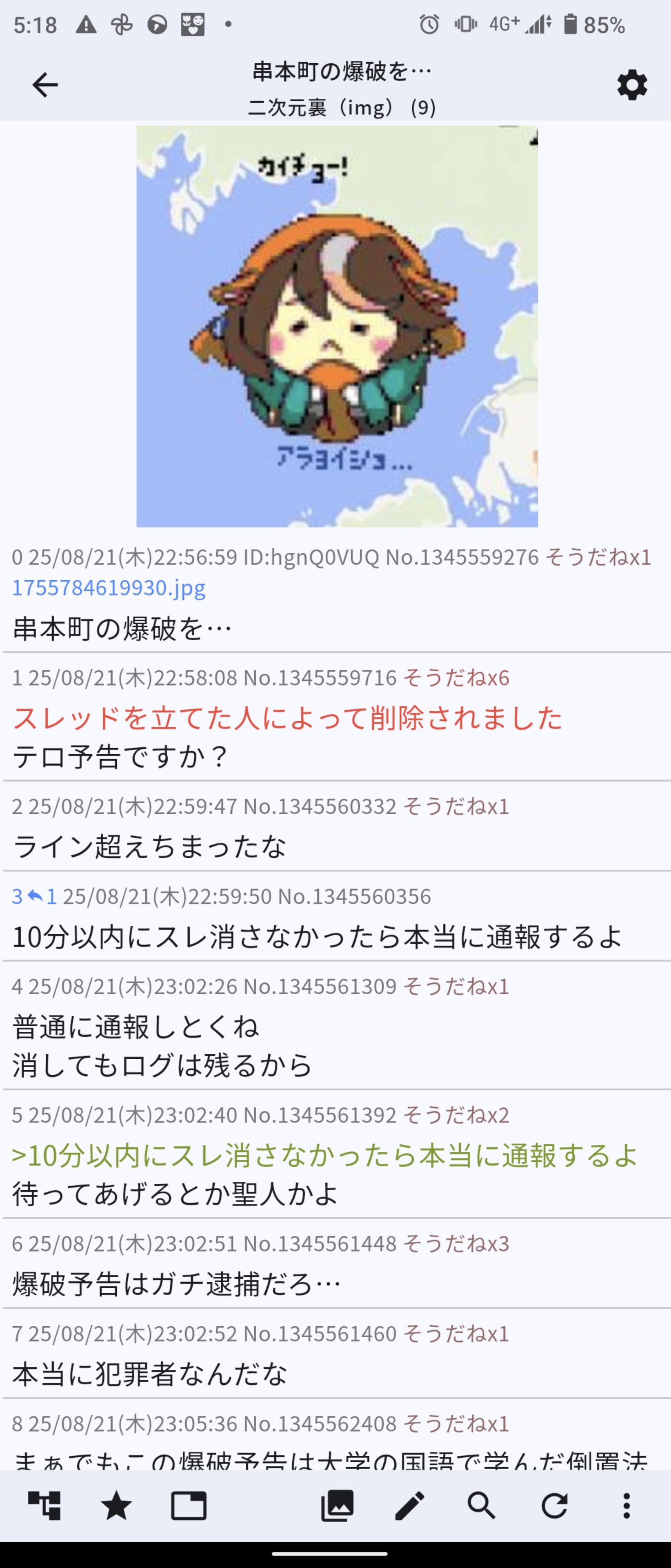 | … | 2725/08/23(土)20:10:51No.1346153906+>爆破予告してたけどまた追い通報するか… |