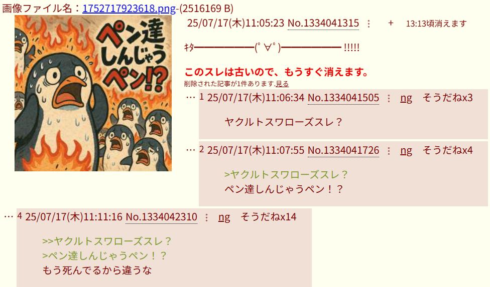 | … | 54625/08/23(土)23:03:30 ID:FuHTAsvUNo.1346225947そうだねx3>🐧スレで人狼ゲームやったら最初に本物の🐧が吊るされて終わりそう |