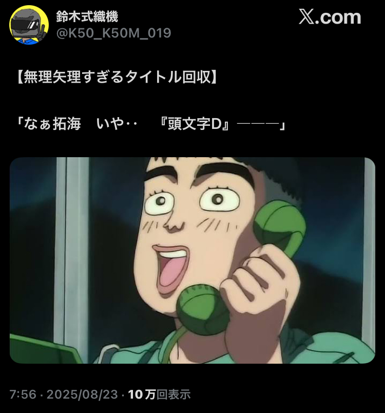 | … | 425/08/24(日)02:22:33No.1346293231そうだねx1アイツのこと初めて『頭文字D』って呼んだの…俺なんだぜ…! |