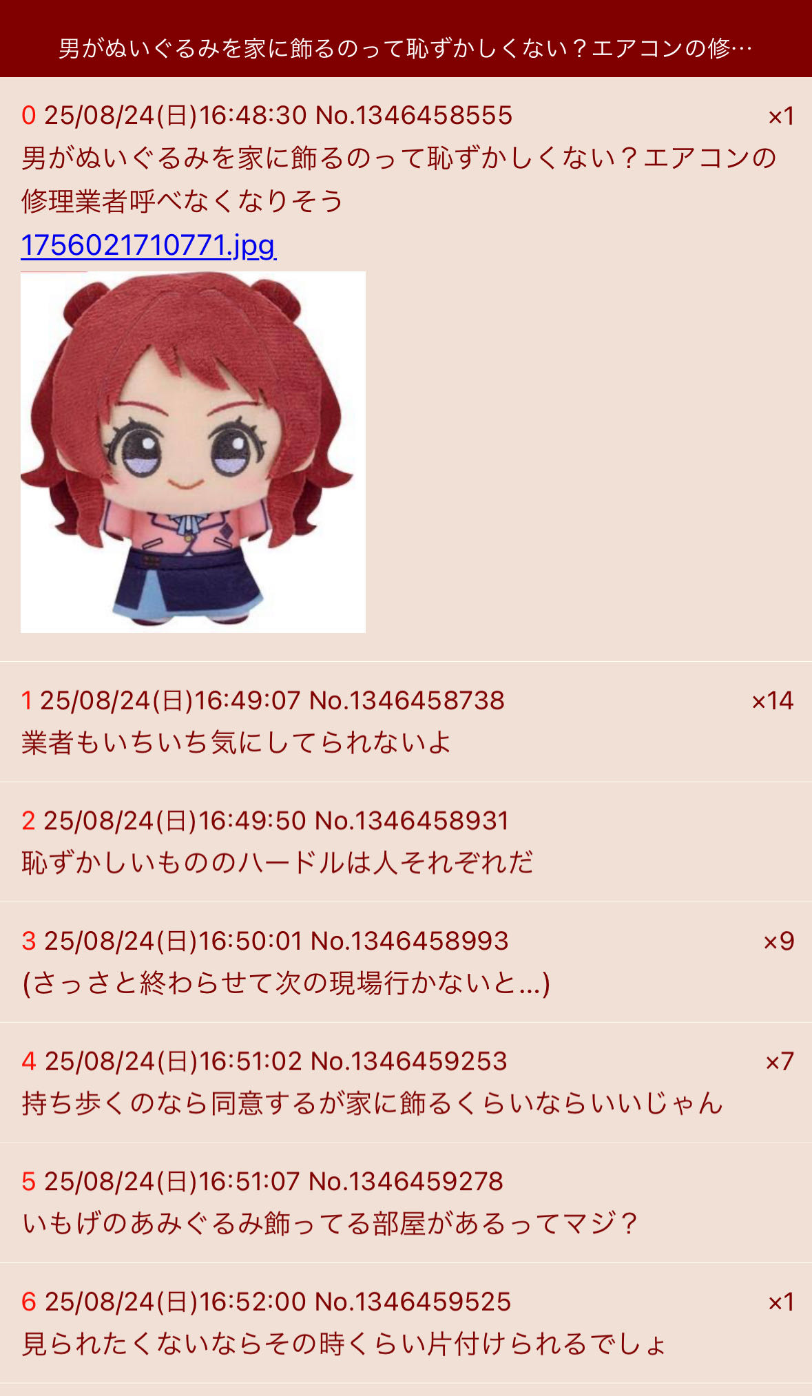 | … | 525/08/24(日)16:51:07No.1346459278+いもげのあみぐるみ飾ってる部屋があるってマジ? |