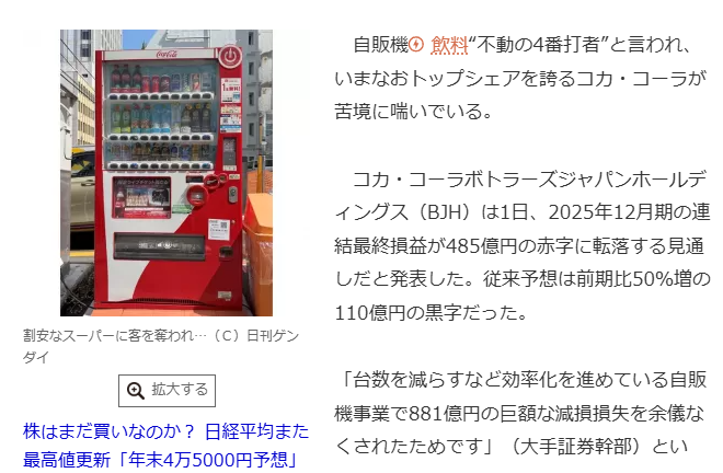 | … | 34525/08/24(日)18:41:12No.1346497178+コカ・コーラは利益出るとこしか起きたくないみたいだし |